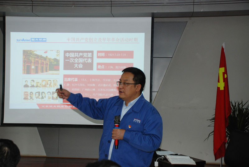黨委書記、星火機床集團公司董事長蔣保權為與會人員作了專題黨課輔導。蔣保權從人類歷史發展進步、中國共產黨誕生前的歷史背景、中國共產黨發展壯大的歷史,以及各個時期黨經受的考驗和歷史轉折關頭領導全國各族人民不斷堅定信仰、明確目標,從勝利走向勝利的光輝歷程。蔣保權指出,每個黨員都要了解黨的光輝歷史,提高修養,嚴格用黨員標準規范自己言行,發揮好模范帶頭作用,堅信只有共產黨才能救中國,只有共產黨才能領導中國革命從勝利走向勝利,最終實現為中國人民謀幸福,為中華民族謀復興的中國夢。