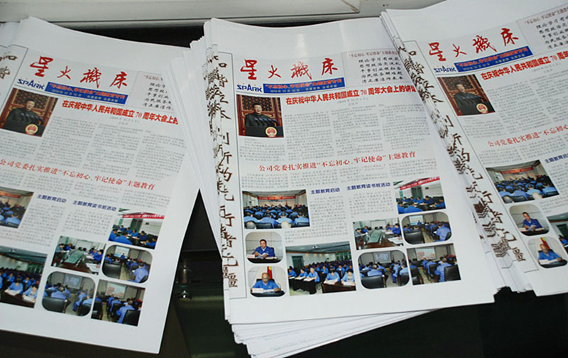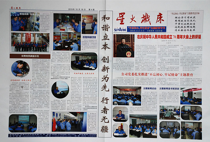 為使“不忘初心、牢記使命”主題教育往深里走,往實里做,幫助廣大黨員學懂弄通習近平新時代中國特色社會主義思想,掌握精髓,激發斗志,指導行動。10月18日,經過認真準備的星火機床《“不忘初心、牢記使命”主題教育專刊》和廣大黨員見面了。本期專刊由公司黨委工作部部長、公司“不忘初心、牢記使命”主題教育領導小組辦公室主任姚保忠策劃,黨委工作部有關人員精心組織稿件、選擇圖片進行編排。專刊以習近平總書記在慶祝中華人民共和國成立70周年大會上的講話為統領,分欄目反映了公司“不忘初心、牢記使命”主題教育動員部署大會、主題教育讀書班、慶祝新中國成立70周年歌詠比賽,市委“不忘初心、牢記使命”主題教育第八巡回指導組指導檢查、專題黨課、“不忘初心、牢記使命”主題教育知識競賽,黨支部書記參加全市“不忘初心、牢記使命”主題教育培訓,公司黨員參觀全市慶祝新中國成立70周年成就展,公司黨委檢查督導基層支部黨建工作,以及公司主題黨日活動和優秀黨員事跡介紹等。專刊彩色印刷,以圖為主、圖文并茂,既是對公司開展“不忘初心、牢記使命”主題教育的全面報導,又是廣大黨員掌握主題教育動態、開展學習的輔導材料,受到了黨委領導的肯定和黨員的好評。