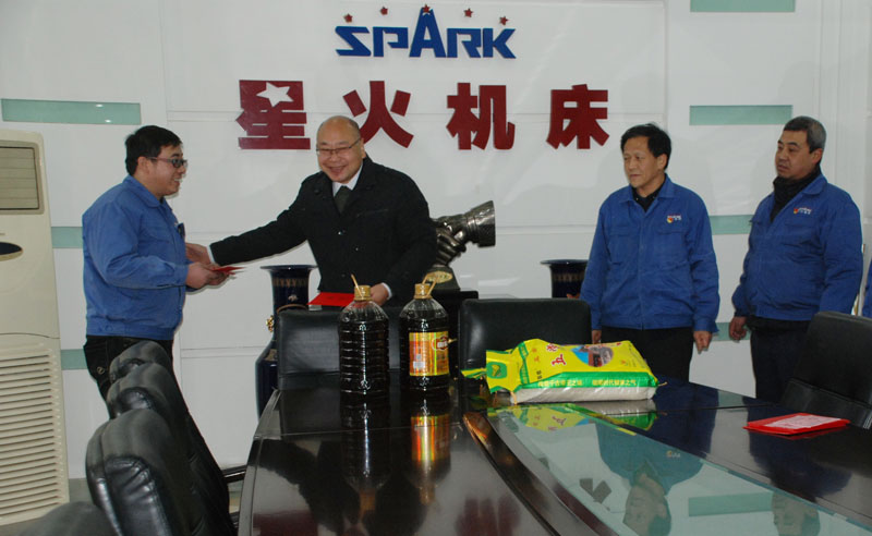 在星火機床公司小會議室,第四慰問組領隊、市國資委副主任江愛民,市國資委企業人事科科長王雙喜為優秀黨員、困難黨員、老黨員發放了慰問品及慰問金,希望通過慰問活動,進一步激勵黨員干部不忘初心、牢記使命,提振干事創業的精氣神。并提前祝大家春節快樂,身體健康。