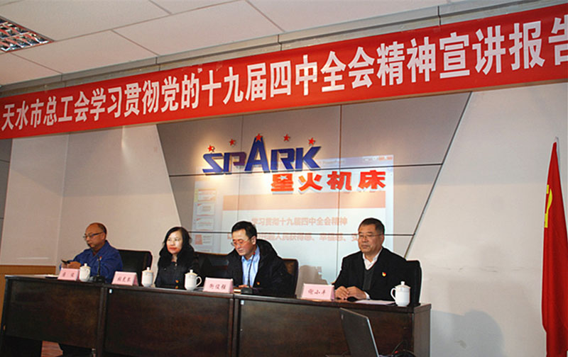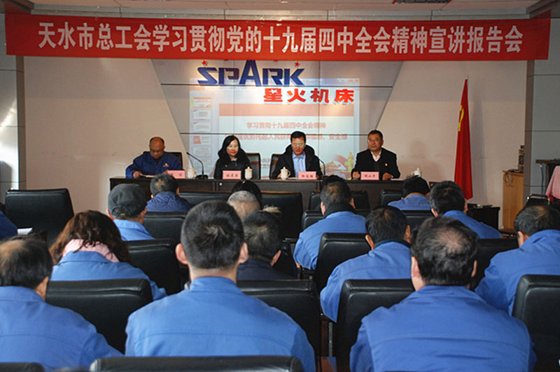 1月7日,天水市總工會學習貫徹黨的十九屆四中全會精神宣講報告會在星火機床公司舉行,天水市總工會邀請中共天水市委宣講團成員、甘肅林業職業技術學院教授謝小平為星火機床公司黨支部書記、分會主席和部分員工作了《以制度優勢托起人民獲得感、幸福感、安全感》為主題的黨的十九屆四中全會精神學習專題宣講報告。天水市總工會黨組成員、副主席張虎琴,副主席衡俊強,星火機床公司黨委副書記、工會主席蔣俊及各黨支部書記、分會主席和部分員工80多人參加了報告會。衡俊強主持報告會。