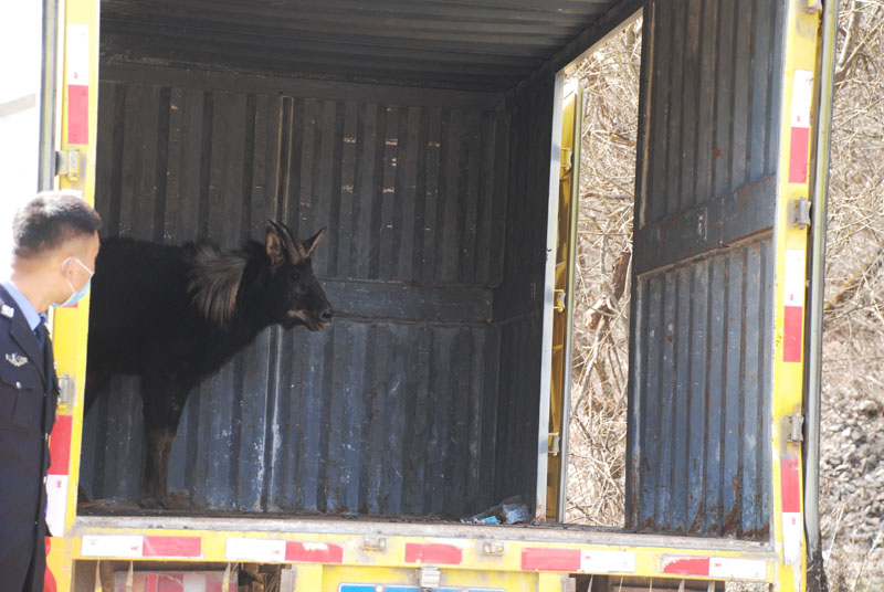 3月18日上午,甘肅省小隴山林區森林公安局會同天水市森林公安局麥積分局及麥積區林草局相關人員來到星火機床公司工業園,經反復研究,確定了捕捉方案。由于鬣羚體積大、爆發力強,致使人無法靠近,抓獲過程比較困難。后經近一個小時的努力,最終在星火機床公司全力配合下,費盡幾番周折,終于將“倔強”的鬣羚裝上了車。在充分考慮生存環境的適應性后,森林警察將鬣羚放歸到了遠離人群的麥積區草灘村管嶺溝附近的山林。
