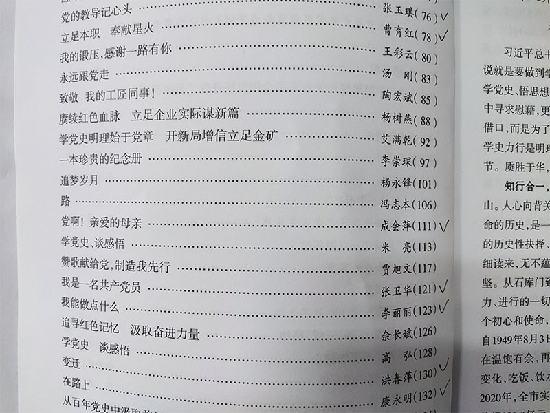 在2021年慶祝建黨100周年之際,天水市國資委、企工委組織開展了“學黨史、談感悟”征文活動。日前,主辦單位已將評選的42篇優秀作品結集成冊,其中星火機床公司七名職工的征文被收入其中。他們分別是退休職工張玉琪的《黨的教導記心頭》、物業公司曹育紅的《立足本職 奉獻星火》、行政綜合管理部成會萍的《黨啊!親愛的母親》、鑄造公司張衛華的《我是一名共產黨員》、物業公司李麗麗的《我能做點什么》、機床研究院洪春萍的《變遷》和黨群工作部康永明的《在路上》。