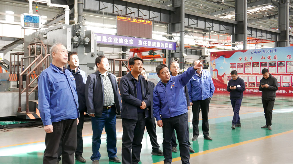 在星火公司裝配生產現場,趙錦銘向趙貴平一行詳細介紹了企業生產經營、產品研發、營商環境等情況,并陪同參觀了公司自主研發的各類大、重型數控機床產品和即將亮相北京國際機床展會的三臺展機。