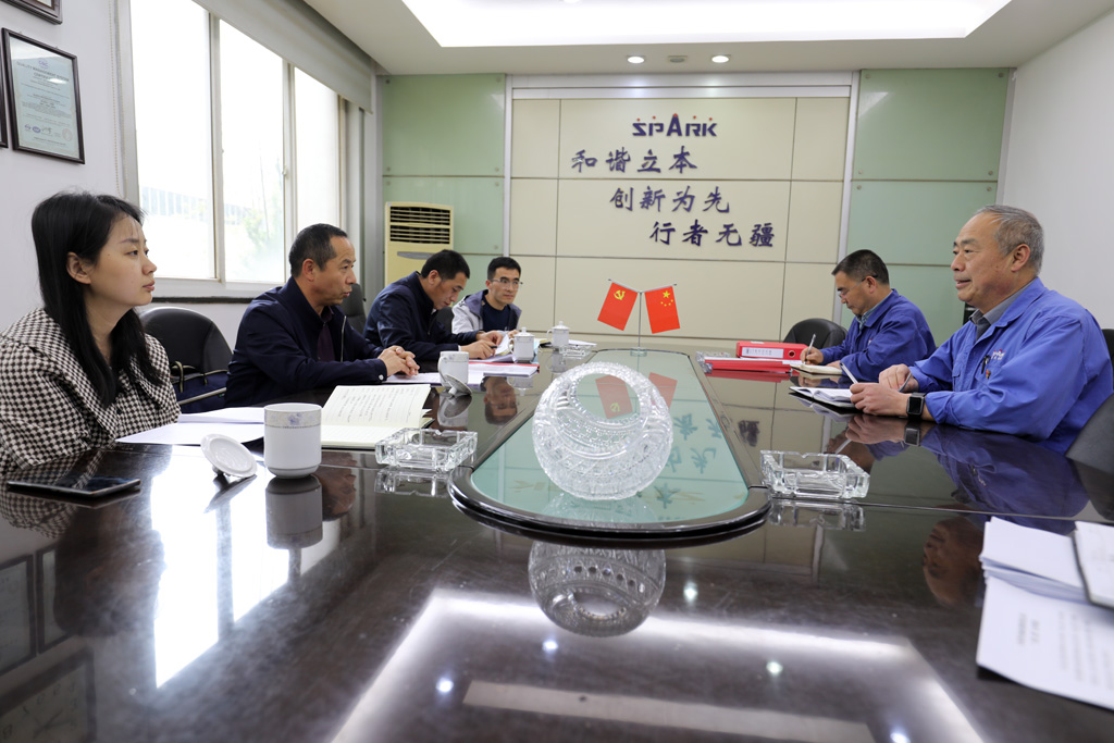 星火機床集團公司副總經理、星火公司總經理趙錦銘向張意志一行詳細介紹了公司結合中心工作,以“三抓三促”行動為抓手,在生產經營、產品研發、科技創新、項目建設以及近期公司產品在北京國際機床展取得的超預期效果等方面成績。