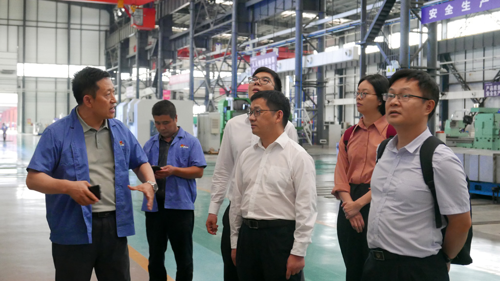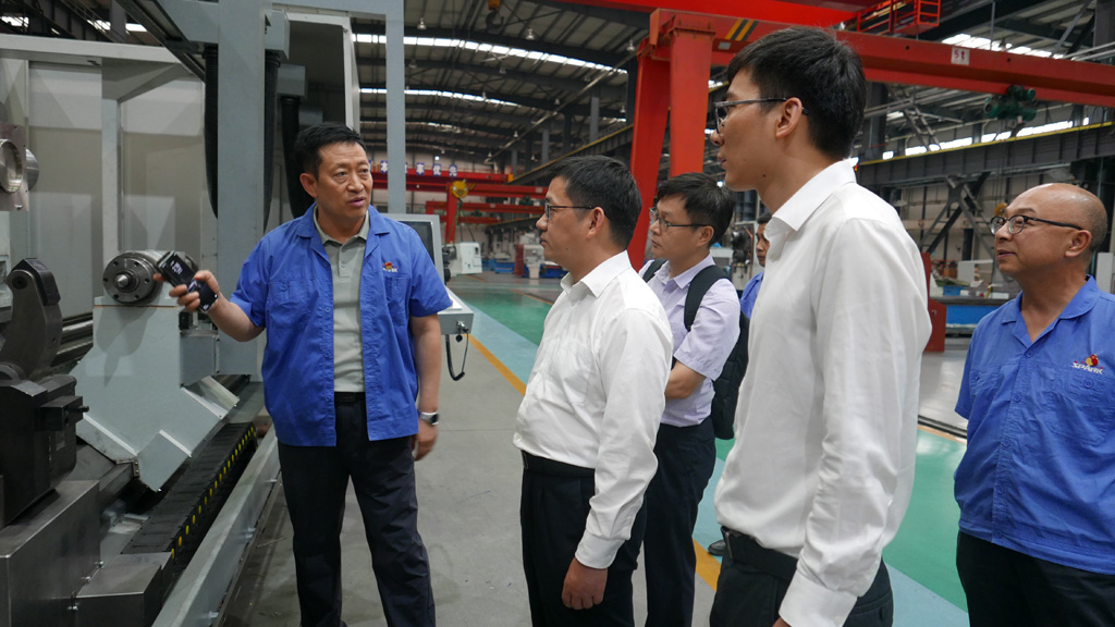 在星火公司生產現場,劉勝向陳新文一行詳細介紹了公司發展歷程、產品種類、加工能力、技術創新、未來發展規劃等,并陪同參觀了公司研發生產的各類大、重型機床,復合材料纏繞設備等。