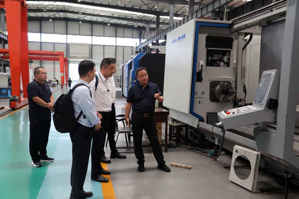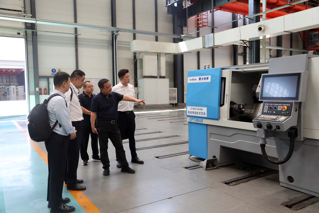 在星火工業園,蔣保權對喬瑞一行的到訪表示熱烈歡迎并親切交流。隨后,蔣保權陪同喬瑞一行參觀了企業加工車間、青重車間以及數控裝配車間等生產現場,向喬瑞一行介紹了五軸聯動車床、重型臥式車床、軋輥磨床等產品的相關情況。