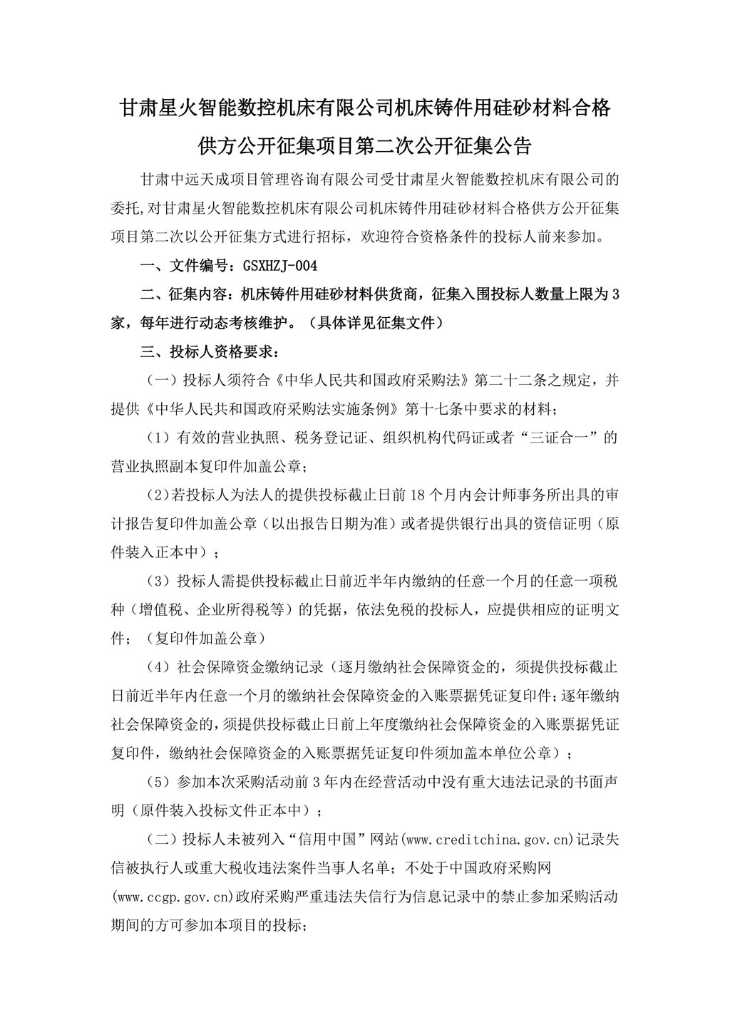 甘肅星火智能數(shù)控機床有限公司機床鑄件用焦炭材料合格供方公開征集項目第二次公開征集公告