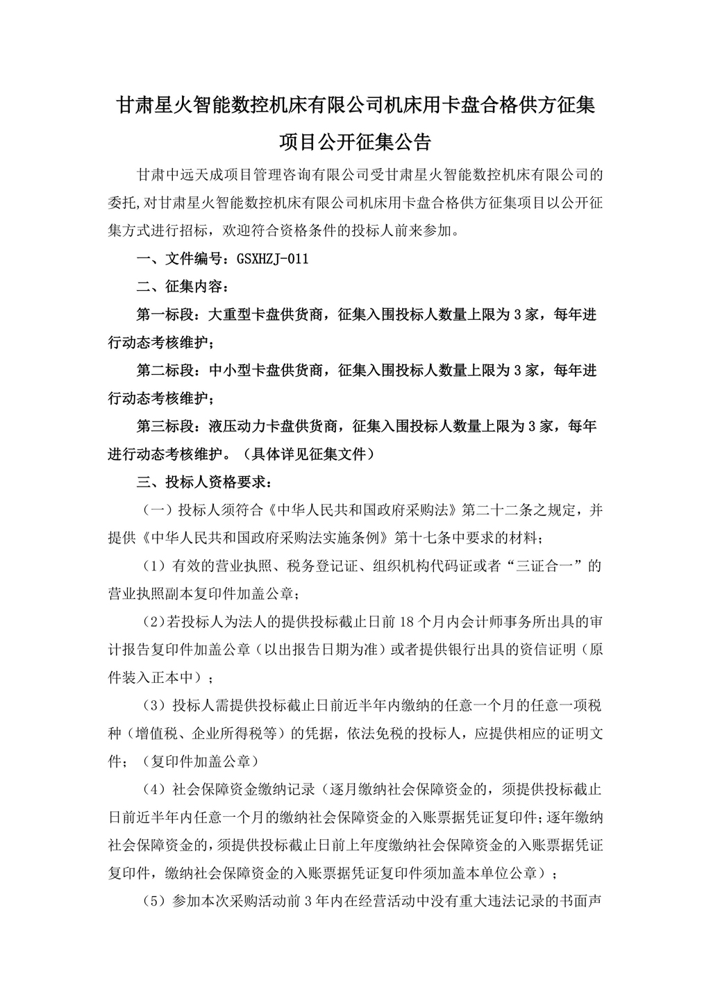 甘肅星火智能數控機床有限公司機床用卡盤合格供方征集項目公開征集公告